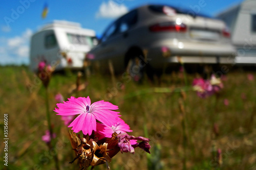 clove, flower, vacation, camping, trailer, car, camper, blooming, field, wild, beauty, background, lawn, bright, closeup, colourful, blossom, pink, beautiful, flora, green, holiday, landscape, natural, nature, plant, purple, rest, summer, sunny