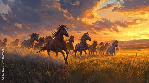 horse, herd, galloping, running, sunset, prairie, gold, field, wild, free, majestic, powerful, beautiful, nature, landscape, sky, cloud, sun, light, ray, warmth, vibrant, colours, autumn, summer, dusk, evening, energy, speed, movement, dust, wind, grass, plain, hill, mountain, background, scene, art, painting, digital, image, artwork