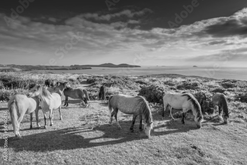horse, herd, animal, wild, heath, pony, meadow, outside, farm animal, beauty, domestic, sea, cliff, coast, england, ocean, heather, evening, sunset, blue, grass, beautiful, coastal, coastline, journey, landscape, nature, romantic, scene, scenery, europa, countryside, danger, dangerous, environment, high, green, white