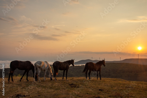mountain, bulgaria, horse, animal, horse, nature, field, pasture, farm, sky, landscape, silhouette, sunset, sun, equine, herd