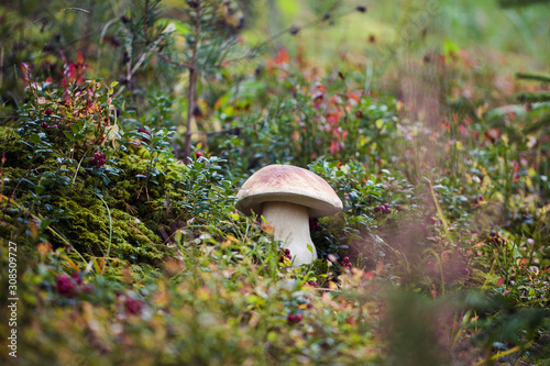 Wild raw boletus mushroom in Latvian forest