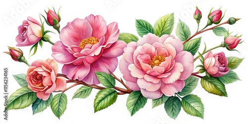 wild rose, watercolor, flower, leaf, tree branch, fashion, photo, floral, botanical, elegant, delicate, hi-res, rose, background, white, nature, art, beauty, illustration, design, floral pattern, romantic, vintage, isolated, wallpaper, poster, texture, pattern, digital artwork, creative, studio, image, print, floral pattern, modern, contemporary