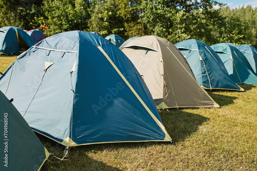 horizontal, relaxation, illuminated, freedom, campground, recreation, outside, photo, sun, festival, many, blue, holiday, sky, leisure, equipment, vacation, activity, grass, sunlight, green, journey, rest, camp, nature, tent, background, color image, tree, morning, summer, weekend, beautiful, adventure, landscape, mountain, hiking, forest, no people