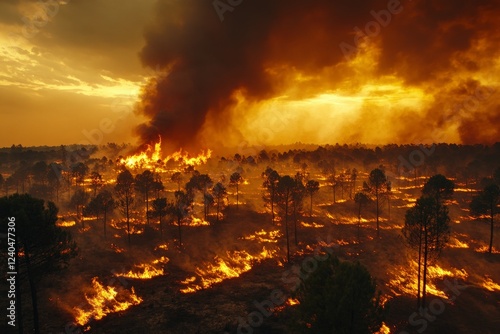 wildfire, sunset, smoke, tree, flames, landscape, nature, destruction, environment, heat, ecosystem, wildlife, emergency, crisis, rural, natural disaster, burning, ash, sky, forest, dark clouds, blaze, charred, recovery, aerial view, survival, prevention