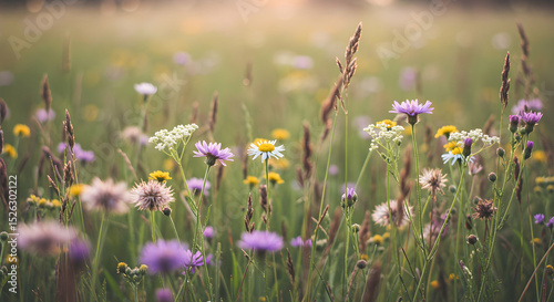 Wildflower Meadow with Purple and Yellow Blossoms in Soft Light