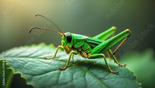 Wildlife scene featuring a green grasshopper on a lush green leaf in outdoor environment