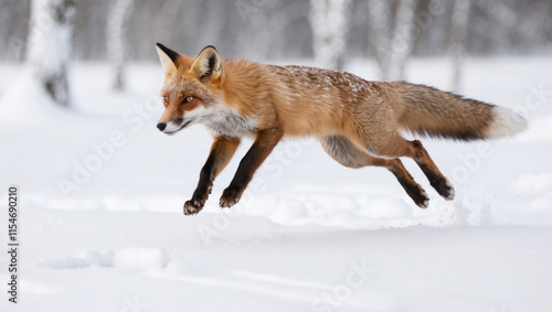 Wildlife shot of a red fox hunting in snow, captured in motion with diffused winter light. Perfect for nature enthusiasts and wildlife visuals.