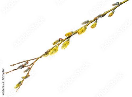 Willow twigs isolated on white background. Spring flowering of trees. Flowers. Blossom. Flat lay, top view