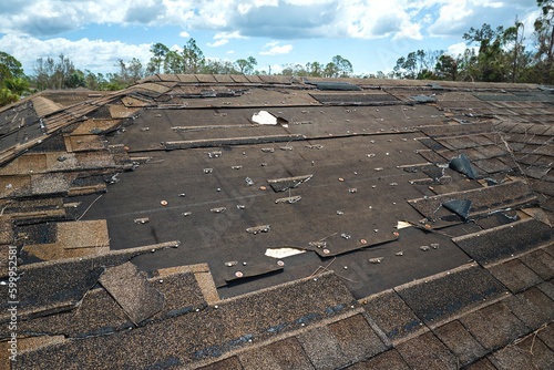 Wind damaged house roof with missing asphalt shingles after hurricane Ian in Florida. Repair of home rooftop concept