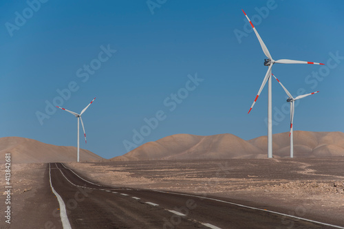 chile, south america, travel, travel destination, photo, outdoors, day, daytime, blue skies, green energy, electricity, renewable energy, scenic, landscape, desert, alternative energy, environmental conservation, wind power, clear sky, road, connection, nobody, horizontal, industrial, wind farm, no people