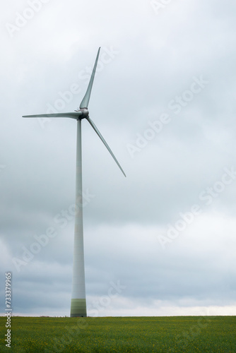 Wind turbine among rapeseed field and green meadows. Vertical photo.