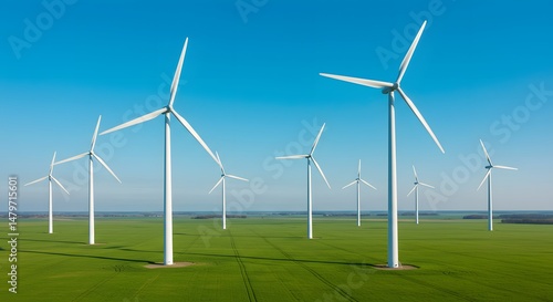 wind turbine, wind energy, renewable energy, clean energy, green energy, alternative energy, wind farm, wind power, power generation, energy production, ecology, environment, nature, landscape, scenery, field, meadow, greenfield, blue skies, clear sky, aerial view, energy, power, technology, electricity, turbine, propeller, sustainable, environmentally friendly, environmental, conservation, climate change, global warming, rural, agricultural, farm, countryside, summer, bright, sunny, day