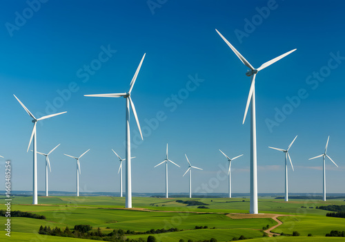 Wind Turbines on a Green Field: A cluster of modern wind turbines stands tall in a vibrant green field under a clear blue sky, symbolizing sustainable energy and environmental consciousness.