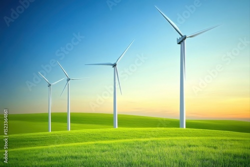 Wind turbines on a green field under a blue sky for energy production, environmental awareness, and sustainable development.