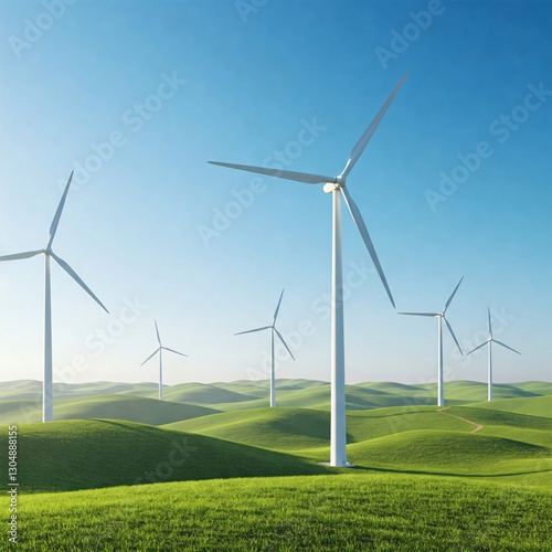 Wind Turbines on Rolling Green Hills under a Blue Sky with Clouds