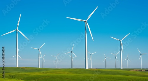 Wind turbines stand tall against a clear, bright sky, a symbol of clean energy and sustainable power generation. These massive structures harness the wind's force, converting it into electricity.