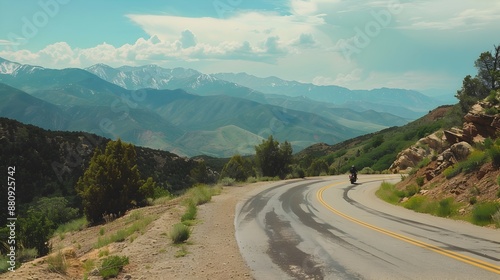 mountain, road, winding, landscape, scenic, nature, adventure, motorcycle, motorbike, biker, journey, freedom, dynamic, motion blur, rugged, peak, vale, lush, twist, turn, dramatic, 1970s, photo, vista, outdoors, travel, route, panorama, mountainous, curvy, asphalt, paved, dirt, gravel, rocky, vegetation, cliff, ridge, slope, windy, twisting, bend, curve, exhilarating, thrilling
