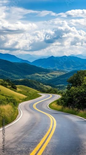 road, mountain, winding, drive, scenic, landscape, summer, sky, cloud, blue, travel, adventure, journey, nature, highway, countryside, asphalt, curve, vacation, freedom, exploration, view, panorama, background, open road, destination, trip, route, way, path, green, hill, tree, sunlight, horizon, serenity, peace, relaxation, escape, discovery, wild, beautiful, amazing, stunning