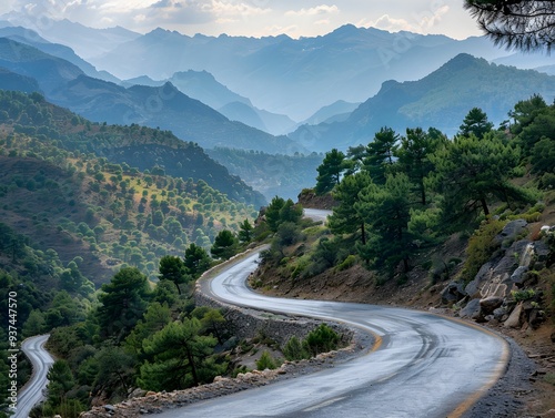 Winding mountain road through lush pine forests with misty peaks in the distance during early morning light