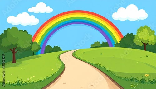 rainbow, path, landscape, green, hill, tree, nature, scenery, pathway, outdoors, summer, sky, cloud, spring, field, grass, road, bright, colourful, high-coloured, background, illustration, cartoon, park, garden, rural, idylli, tranquil, serene