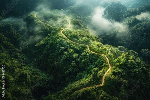 path, forest, winding, fog, tree, green, nature, landscape, mountain, hill, aerial, view, jungle, foliage, timberland, canopy, misty, sunlight, mist, sky, cloud, lush, vegetation, vibrant, scenic, natural, beauty, adventure, journey, travel, environment, ecosystem, exploration