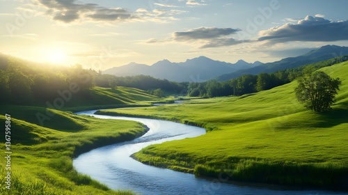 landscape, nature, river, mountain, vale, meadow, green, sunset, scenery, tranquil, idylli, serene, beautiful, picturesque, flowing, water, grass, tree, sunlight, cloud, evening, summer, outdoors, environment, beauty, travel, destination, panorama, wilderness, peace, harmony, vibrant, lush, colourful, inspiring, breathtaking, wanderlust