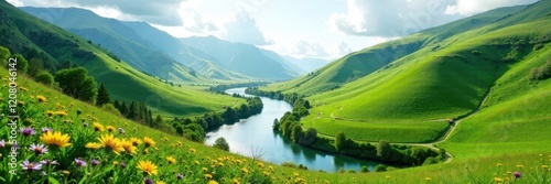 Winding river through lush green hills and valleys, Landscapes, Wildflowers, Lush