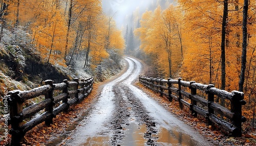 path, road, tree, forest, autumn, fall, leaf, yellow, gold, fence, wooden, branch, winter, snow, hillside, scenery, nature, landscape, outdoors, daylight, overcast, sky, wet, mud, travel, journey, rural, tranquil, misty, foliage, cold, glacé, view, scenic, season, slope, countryside, foggy, environment, natural, beautiful, calm, serenity, peaceful, atmosphere, distance, remote