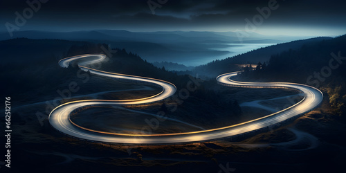 Winding Road in Mountainous Landscape at Night, aerial view of a winding mountain road illuminated by vehicle lights at twilight