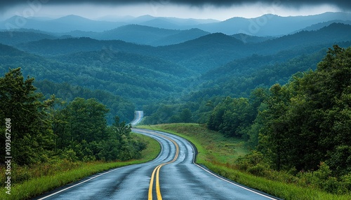 road, winding, mountain, mountain, range, hill, tree, forest, foliage, green, blue, mist, fog, cloudy, sky, rain, wet, asphalt, pavement, yellow, line, grassy, roadside, nature, scenic, landscape, travel, journey, rural, peaceful, serene, tranquil, majestic, breathtaking, beautiful
