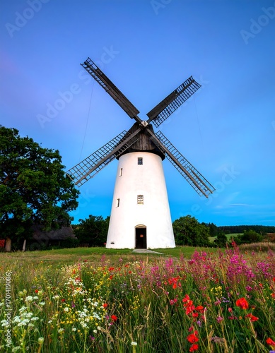windmill, field, flower, dawn, sky, tree, rural, vintage, landscape, nature, tranquil, idylli, beautiful, summer, light, colourful, classic, historic, architecture, grass, europa, calm, old, tower