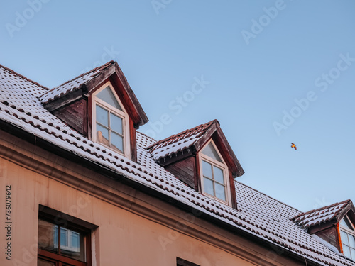 Windows of the attic floor in an old house in the center of Vilnius in winter