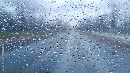 Windshield with moisture and water droplets with road in the background
