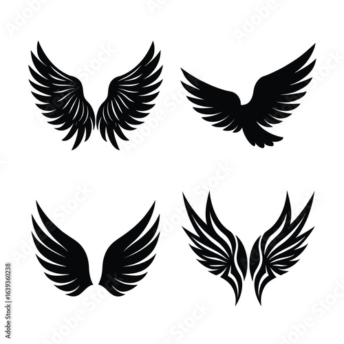 wing, icon, vector, graphic, silhouette, fly, bird, angel, freedom, flight, feather, air, winged, design, symbol, nature, animal, heaven, sky, open, light, fly up, liberty, flutter, spirit, creature, peace, helicopter, aviation, wing, eagle, tattoo, illustration, set, black, flying, hawk, art, signs, nubes, love, logotype, tribal