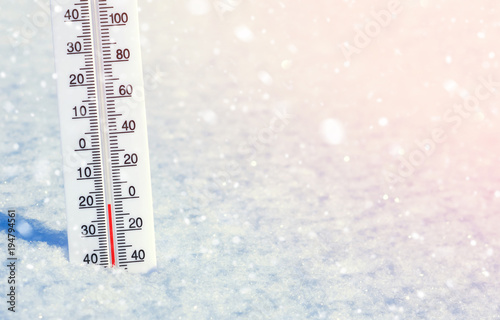 Winter background with thermometer in clean shiny snow.