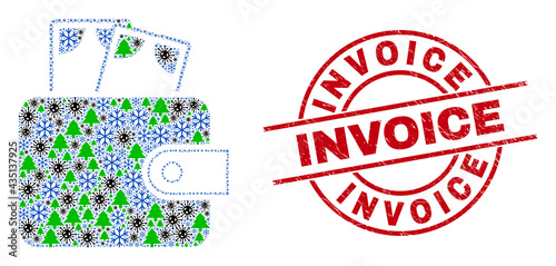 Winter Covid collage cash purse, and distress Invoice red round stamp seal. Mosaic cash purse is made of SARS virus, fir-tree, and snow flake symbols. Red Invoice stamp seal uses circles and lines.