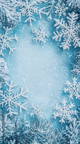 winter, snowflake, frost, decoration, blank space, seasonal, cold, creative, arrangement, snow, branch, holiday, nature, blue, texture, festive, cosy, frame, design, greeting, chilly, icy, serene, landscape, winter landscape, white, calmness, elegance, peaceful, unique, inviting, customization, cheerful, contrast, graphic design, aesthetic, harmony