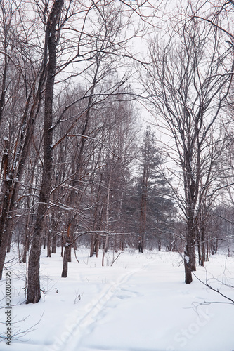 Winter forest landscape. Tall trees under snow cover. January frosty day in the park.
