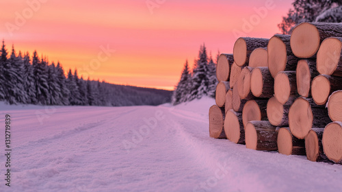 winter, forest, sunset, snow, log, nature, landscape, tree, horizon, sky, pink, orange, cold, season, outdoors, evening, wood, nobody, firewood, path, track, scenic, deforestation, ecology, environment, frost, pile, stacked, rural, countryside, temperature, mountain, remote, isolation