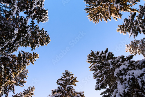 winter, forest, taiga, tree, tree, treetop, coniferous, evergreen, spruce, picea, abies, landscape, wood, timberland, snow, snowy, frost, frosted, blue, clear, sky, tree branch, plant, nature, natural, up, bottom, below, green, environment, season, christmas, outdoors, sunlight, day, daylight, nobody, copy space, photo, finland, tall, big, ecosystem, up high, wilderness, scene, cold