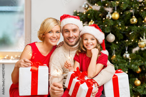 winter holidays, family and celebration concept - happy mother, father and little daughter in santa helper hats with gifts and sparklers over christmas tree background