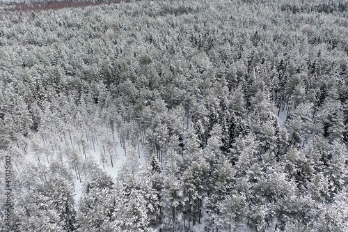 winter in a pine forest landscape, trees covered with snow, January in a dense forest seasonal view