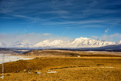 Winter landscape of Mongolia. White mountain background and yellow valley
