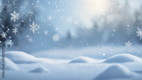 Winter landscape with falling snowflakes and snow drifts. Christmas background with copy space
