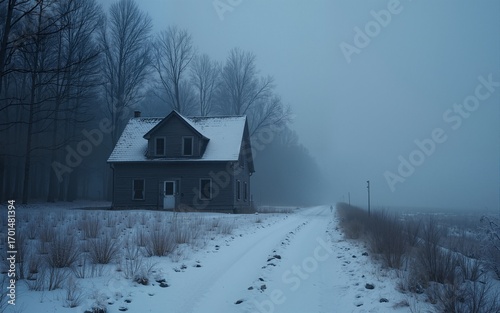 rural, path, scarey, realistic, hill, mood, winter, creepy, isolated, atmosphere, dramatic, dark, tree, haunted, intriguing, old, abandoned, setting, detailed, house, snow, night, gothic, illustration, landscape, art, winter landscape, fog, cold, night scene, misty, digital artwork, artwork, eerie, mysterious