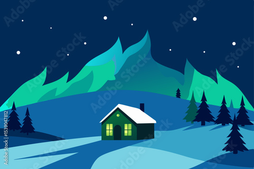 christmas, winter, snow, house, landscape, tree, christmas, night, holiday, vector, illustration, home, village, season, scene, card, cold, bungalow, sky, snowflake, cartoon, celebration, decoration, tree, new