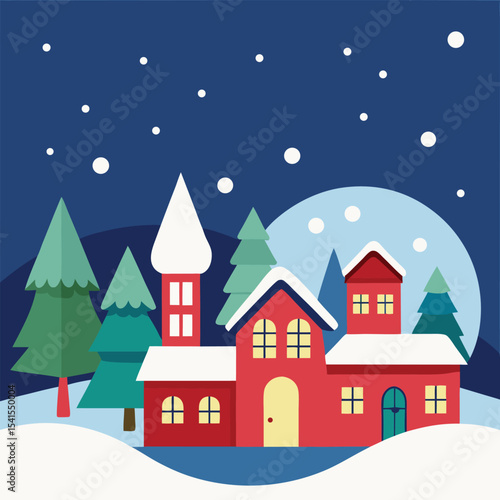 christmas, winter, house, snow, holiday, landscape, tree, vector, christmas, night, village, illustration, cartoon, home, season, town, scene, snowflake, building, cold, city, sky, decoration, card, celebration