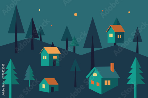 christmas, house, winter, snow, home, tree, vector, landscape, christmas, village, holiday, illustration, building, cartoon, season, snowflake, bungalow, scene, night, decoration, town, sky, cold, architecture, card