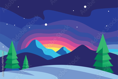 winter, christmas, landscape, snow, sky, vector, tree, night, mountain, nature, illustration, house, scene, cold, holiday, forest, season, mountain, christmas, moon, card, hill, celebration, decoration, star