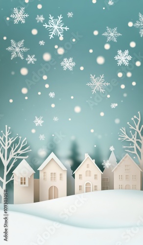 Winter landscape with paper houses and snowflakes on a soft blue background